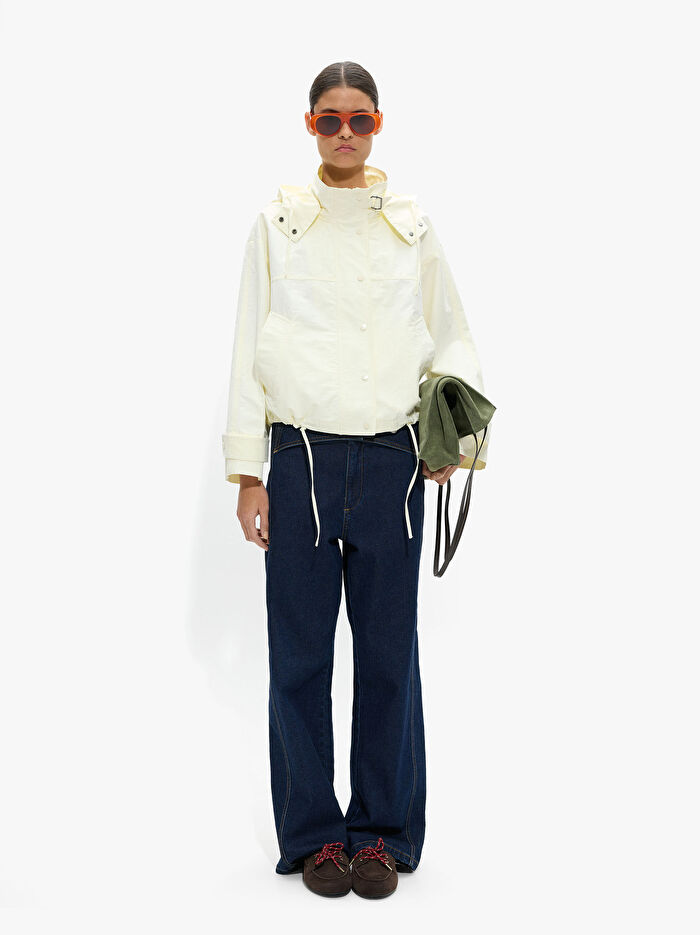 Çıkarılabilir kapüşonlu, sade ceket; ayarlama ipleri. Toka detaylı yüksek yaka. Gizli fermuar kapamalı ve düğmeli yırtmaç. Yan cepler. Uzun kollu. Büzgü ipli etek ucu. Model 1.79 m boyunda ve XS-S beden giymektedir.