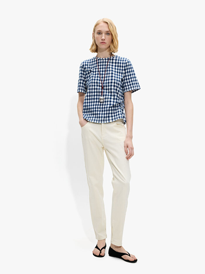 Kare desenli ve yan, üst ve alt büzgülü pamuklu t-shirt. %100 pamuktan üretilmiştir. Yuvarlak yaka. Kısa kollu. Model 1.78 m boyunda ve XS-S beden giymektedir.