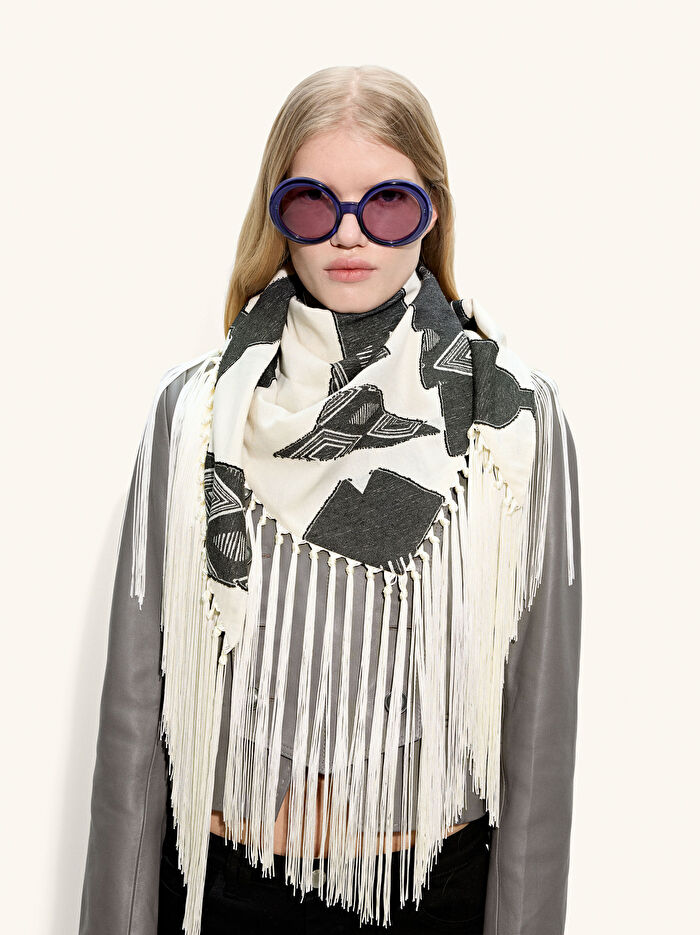 Pamuklu jakarlı kumaştan kare atkı. Kenarlarında püsküller. Her tarza zarif ve çok yönlü bir dokunuş katar.