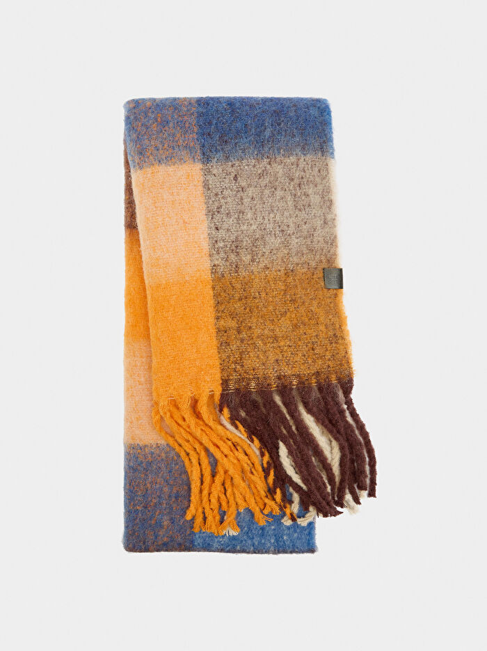 Kontrast renklerde kareler ve püsküllerle süslenmiş atkı. Pratik, hafif ve kışlık görünümleri tamamlamak için ideal.
