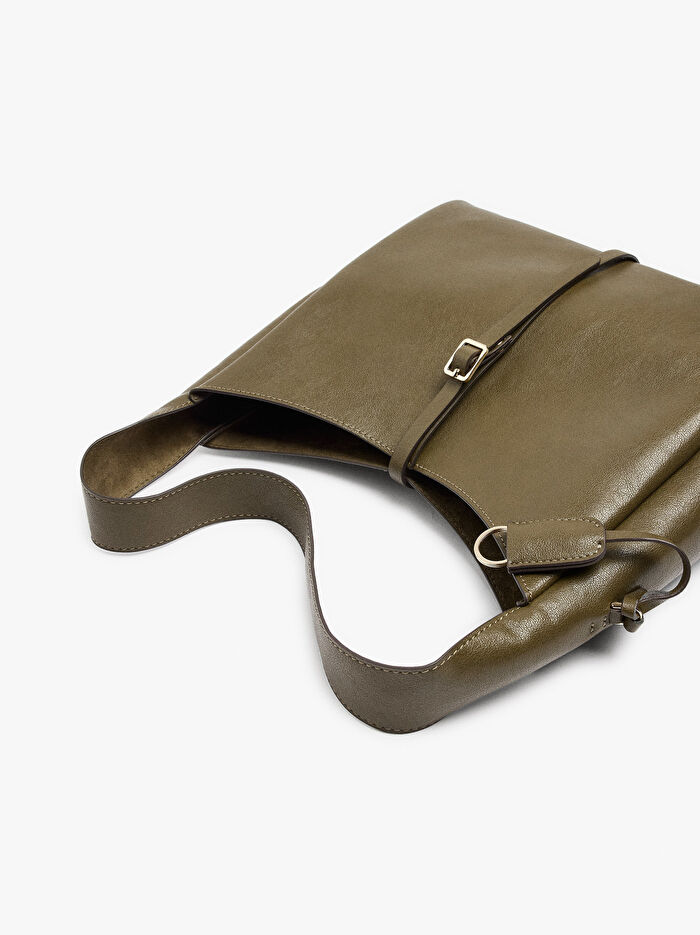 Büyük omuz çantası. Astar ve iç cep. Dekoratif tokalı manyetik kayış ile kapatma. Bir tarafta çıkarılabilir charm. Sabit askı.
