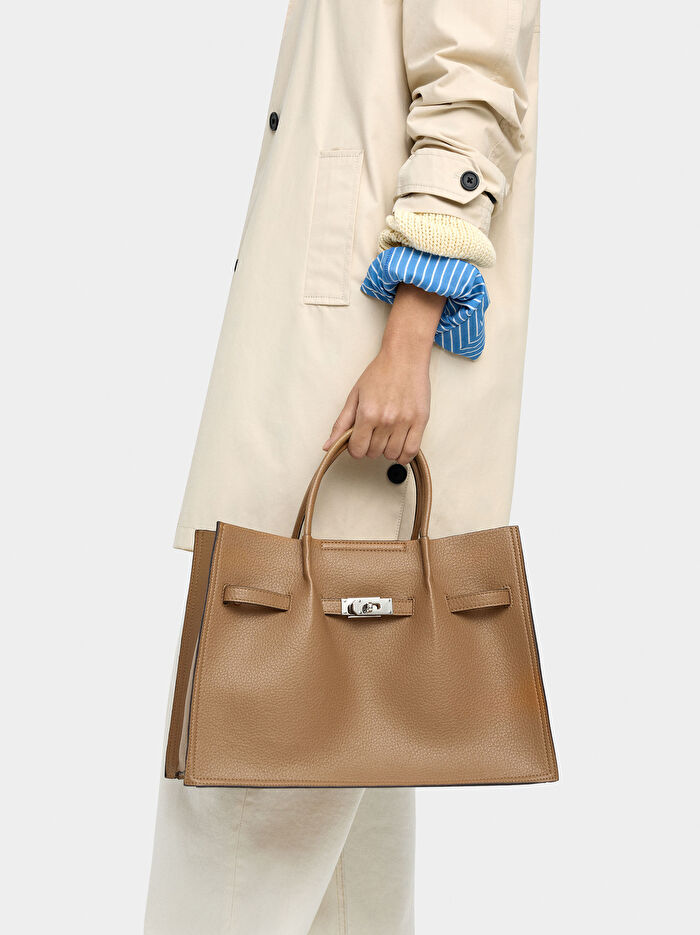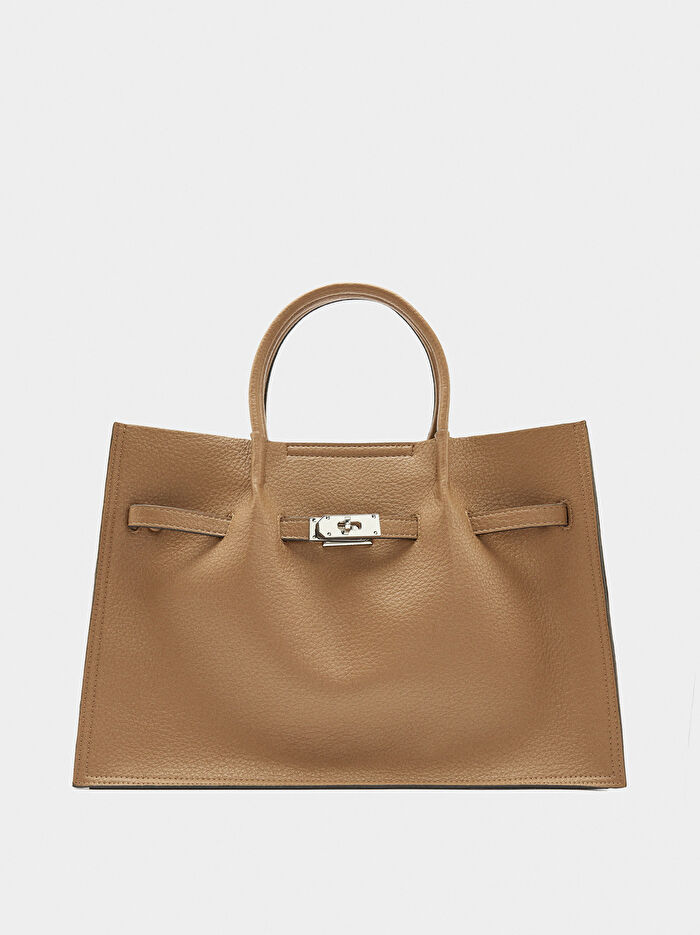 Ön kısmında doku ve kemer detayı bulunan büyük ve yapılı tote çanta. İç astar. Manyetik kapama. Sabit el sapları. Ayarlanabilir ve çıkarılabilir çapraz askı çanta askısı dahildir.