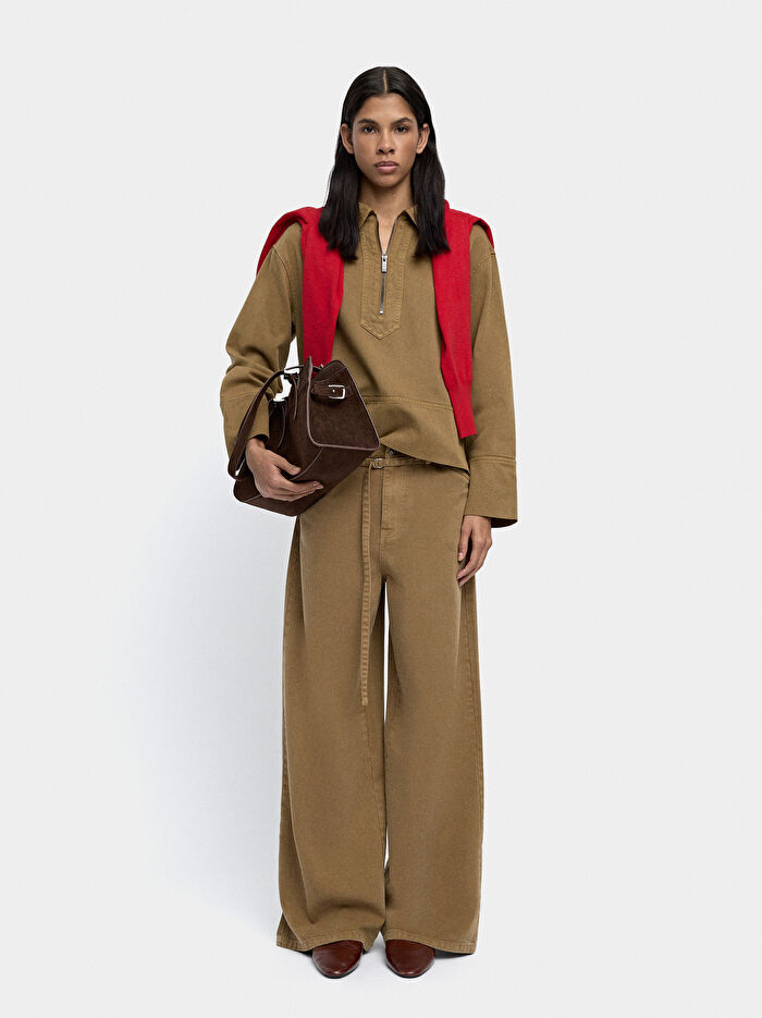 Düz kesim geniş paça denim pantolon. Ön kısımda iki cep. Arka kısımda iki cep. Ayarlanabilir kemer detayı. Kemer halkaları. Düğme ve fermuarlı yırtmaç. Model 1,76 m boyunda ve 34 beden giyiyor.