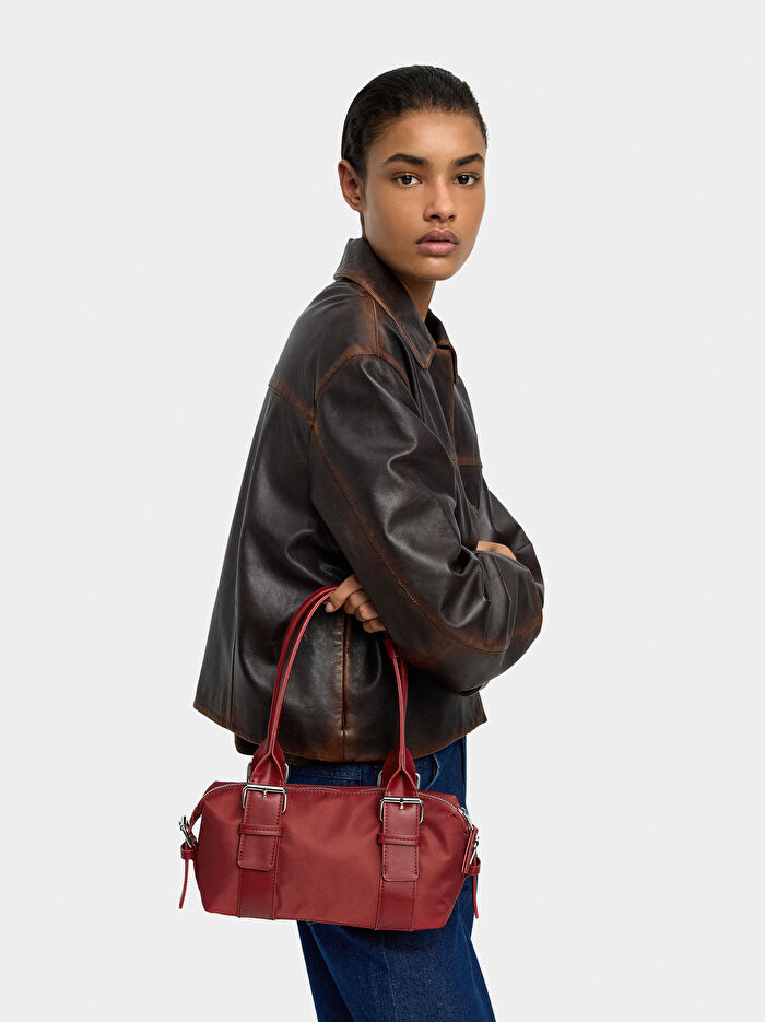 Küçük dikdörtgen omuz çantası. Güçlendirilmiş teknik kumaştan üretilmiştir. Astar ve iç cep. Toka detaylı omuz askıları. Ayarlanabilir ve çıkarılabilir çapraz askı çanta askısı dahildir.
