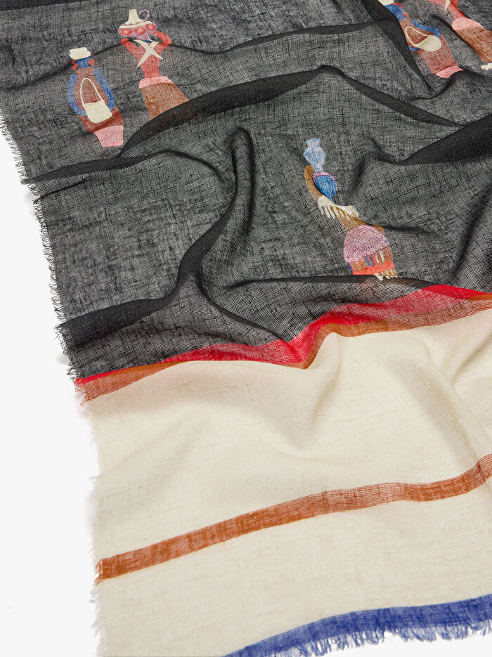 Keten karışımlı, hafif ve yumuşak desenli şal. Kenarlarında ince saçaklar. Zarif ve çok yönlü, her görünüme renk ve sofistike bir dokunuş katar.