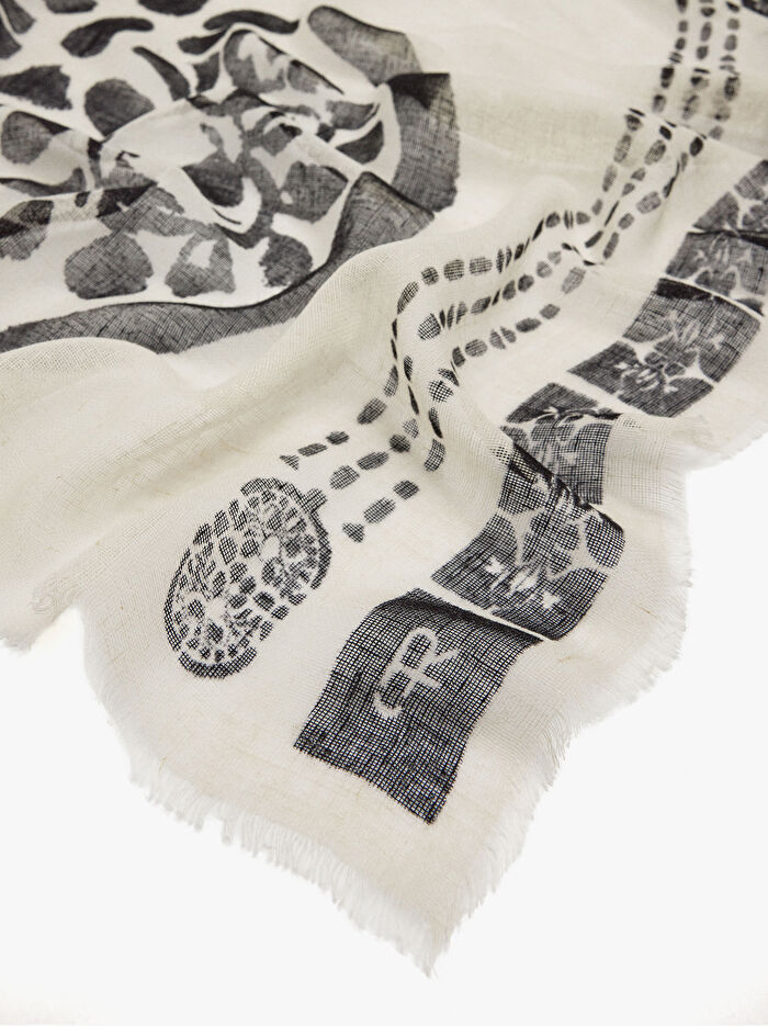 Keten karışımlı, hafif ve yumuşak desenli şal. Kenarlarında ince saçaklar. Zarif ve çok yönlü, her görünüme renk ve sofistike bir dokunuş katar.