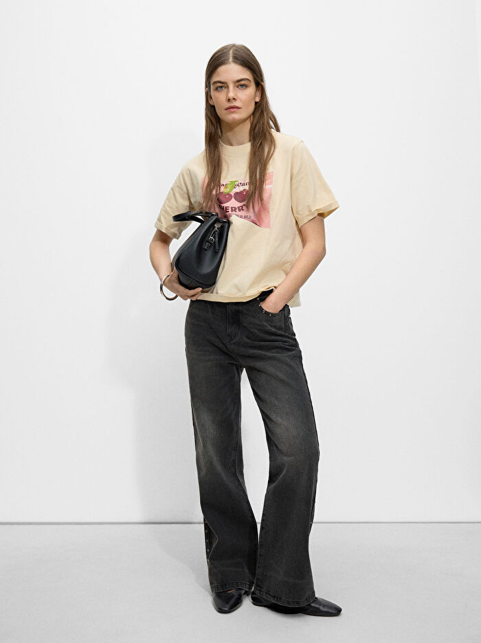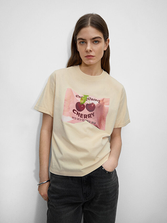 Kiraz desenli pamuklu tişört. Yuvarlak yakalı. Kısa kollu. Model 1,76 m boyundadır ve S beden giymektedir.