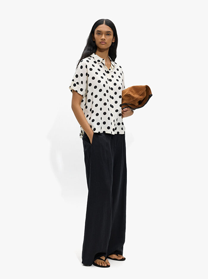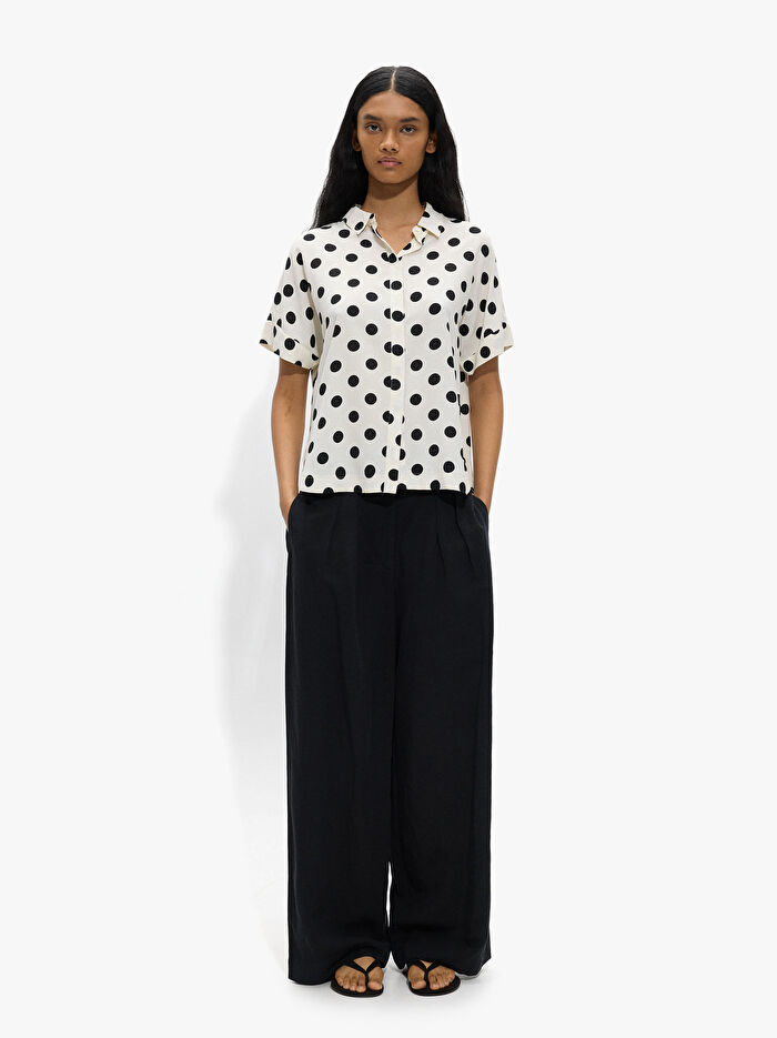 Düşük kesimli kısa kollu, bol kesimli gömlek. Gizli düğmeli yırtmaç. Yuvarlak etek ucu. Model 1,77 m boyunda ve XS-S beden giyiyor.