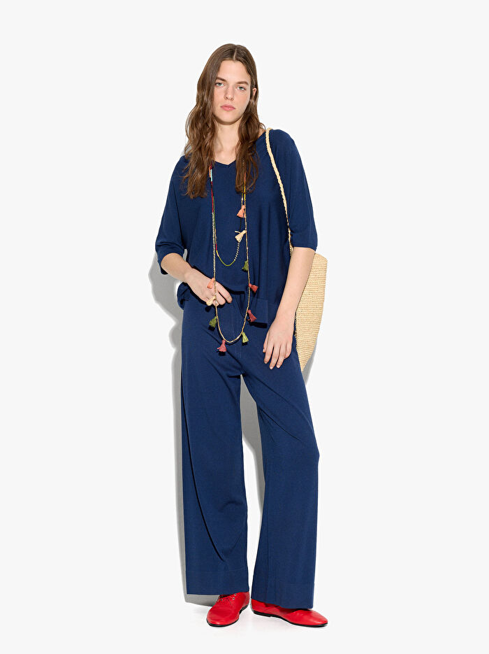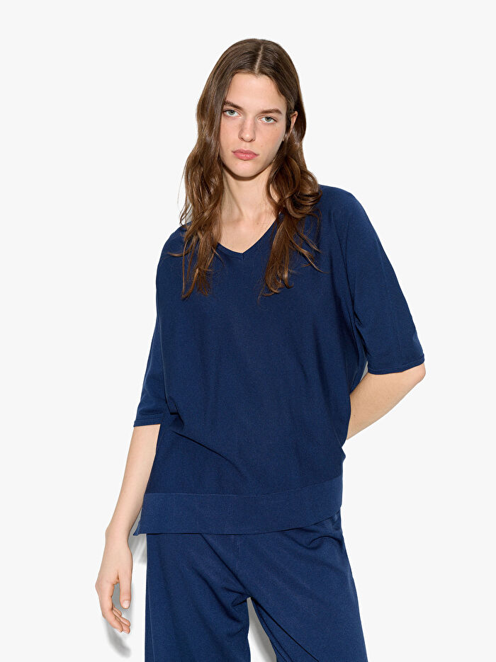 Akan örgüde düşük kısa kollu kazak. V yaka. Alt yan yırtmaçlar. Model 1.75 m boyunda ve XS-S beden giymektedir.