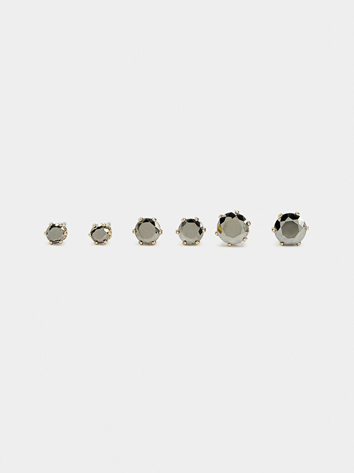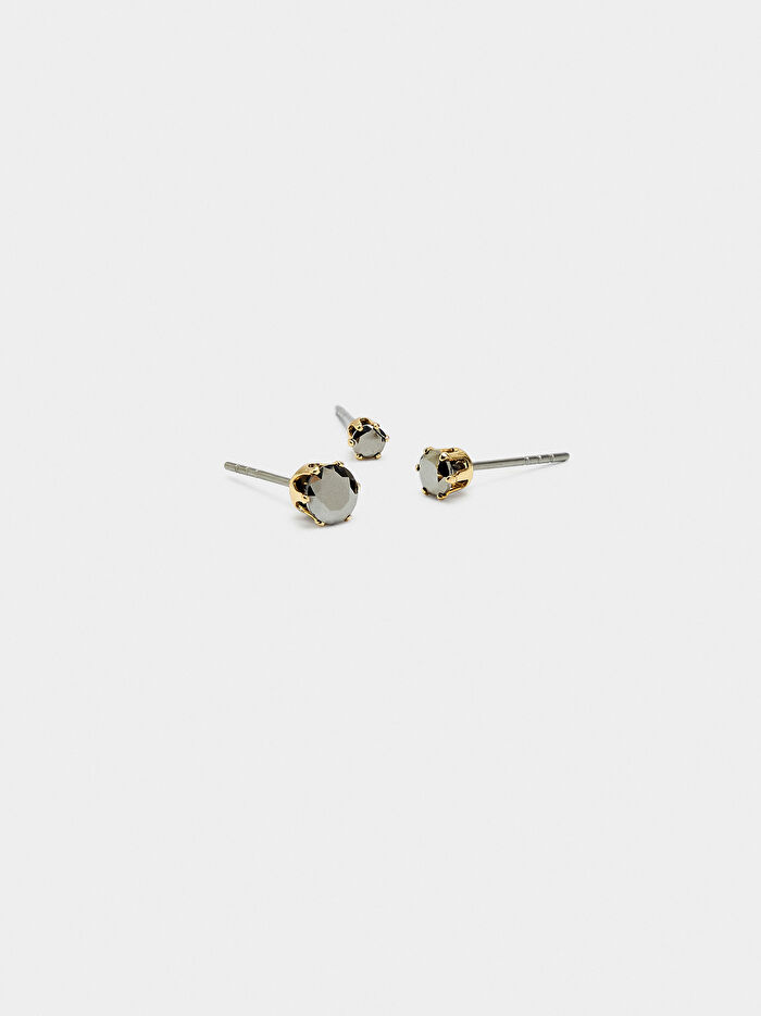 Farklı boyutlarda kristallerle süslenmiş üç çift küpe seti.