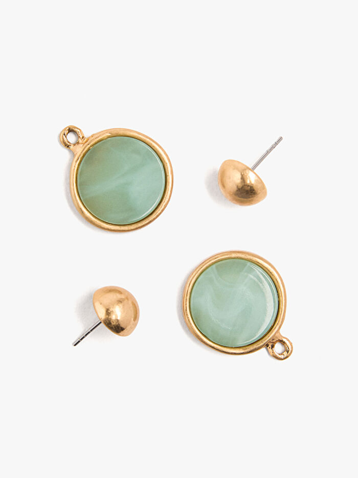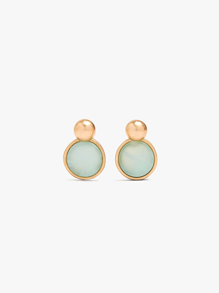 Kısa, yuvarlak şekilli küpe. Çıkarılabilir yarım küre taban. Taş efektli, yuvarlak reçine charm. Eskitme efekti.