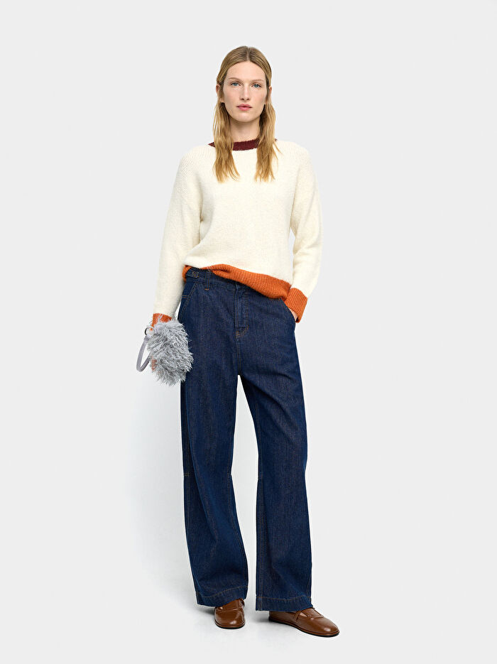 Kontrast renklerde nervürlü kenarlı düz örgü triko. Yuvarlak yaka. Uzun kollu. Model 1,80 m boyunda ve XS-S beden giyiyor.
