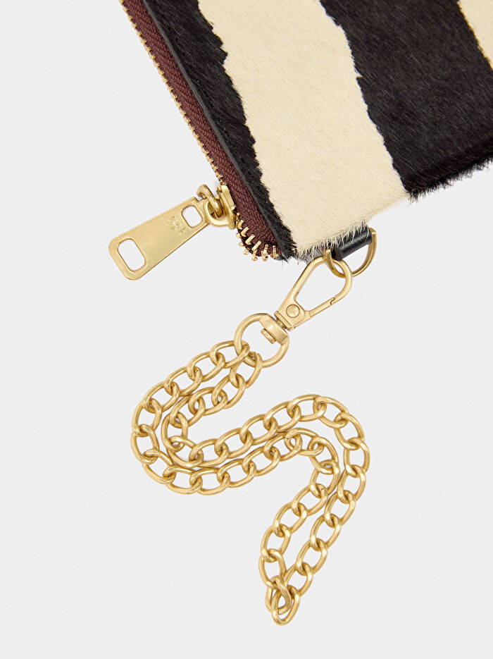 Kürk ve hayvan desenli çok amaçlı deri çanta. Kontrast renkli iç astar. Fermuarlı kapama. Çıkarılabilir zincir askı.