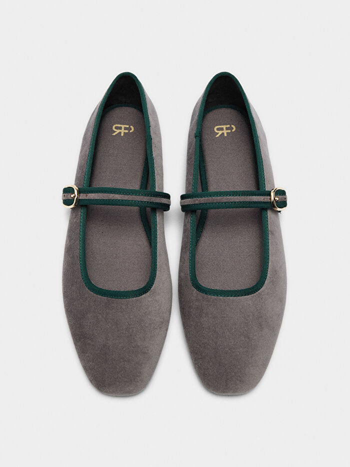 Kontrast renkli kenarlı kumaş babet. Ayar için tokalı ön kısımda kayış. Yastıklı iç taban. Oval burunlu. Termoplastik poliüretan taban.