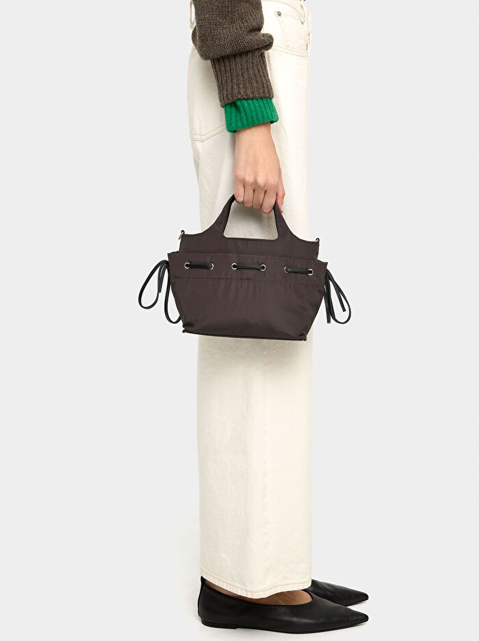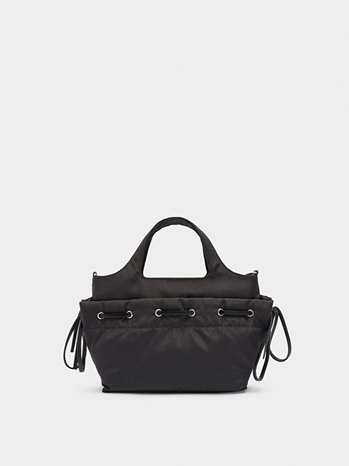 Çapraz kordonlu küçük teknik kumaş tote çanta. Astar ve iç cep. Dış cep. Fermuarlı kapama. Sabit el askıları. Ayarlanabilir ve çıkarılabilir çapraz askılı çanta askısı.