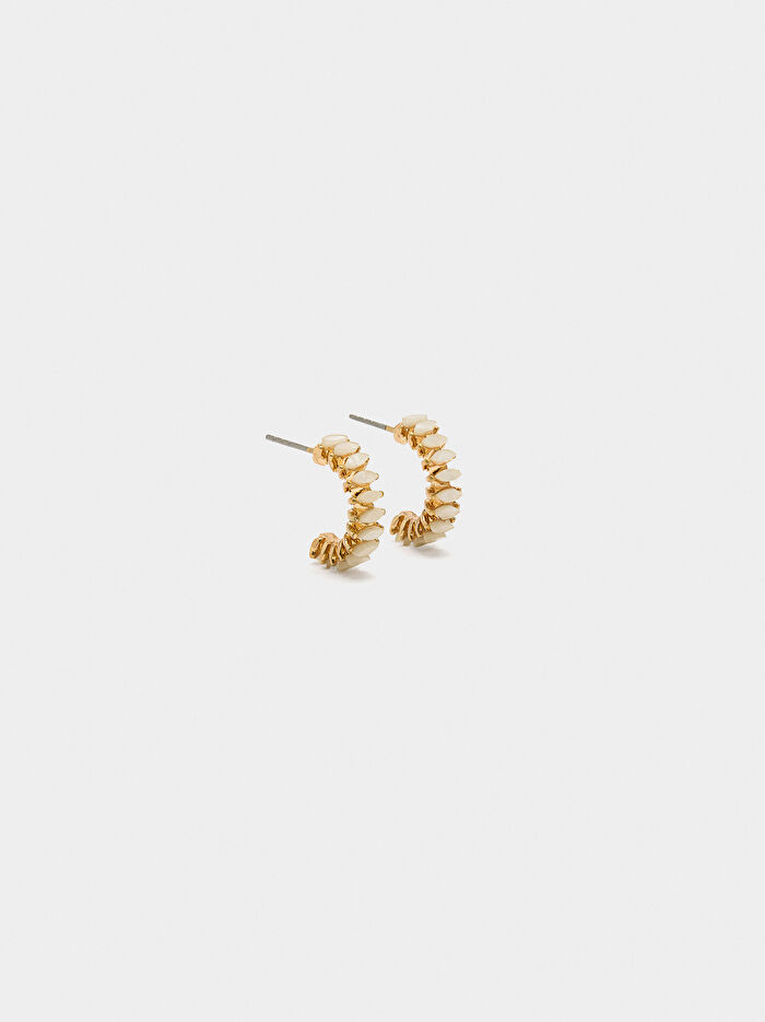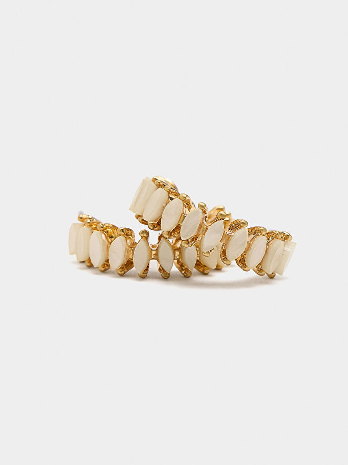 Reçinede yaprak şekilleri bulunan kısa ve açık halka küpeler. Yuvarlak uç detaylı metal kenarlar.