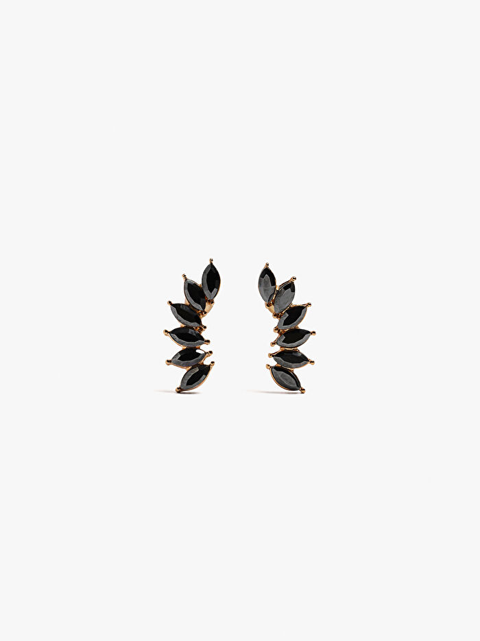 Yaprak şekilli ve kristalli kısa küpe. Yuvarlak uçlu metalik kenarlar ve detaylar.