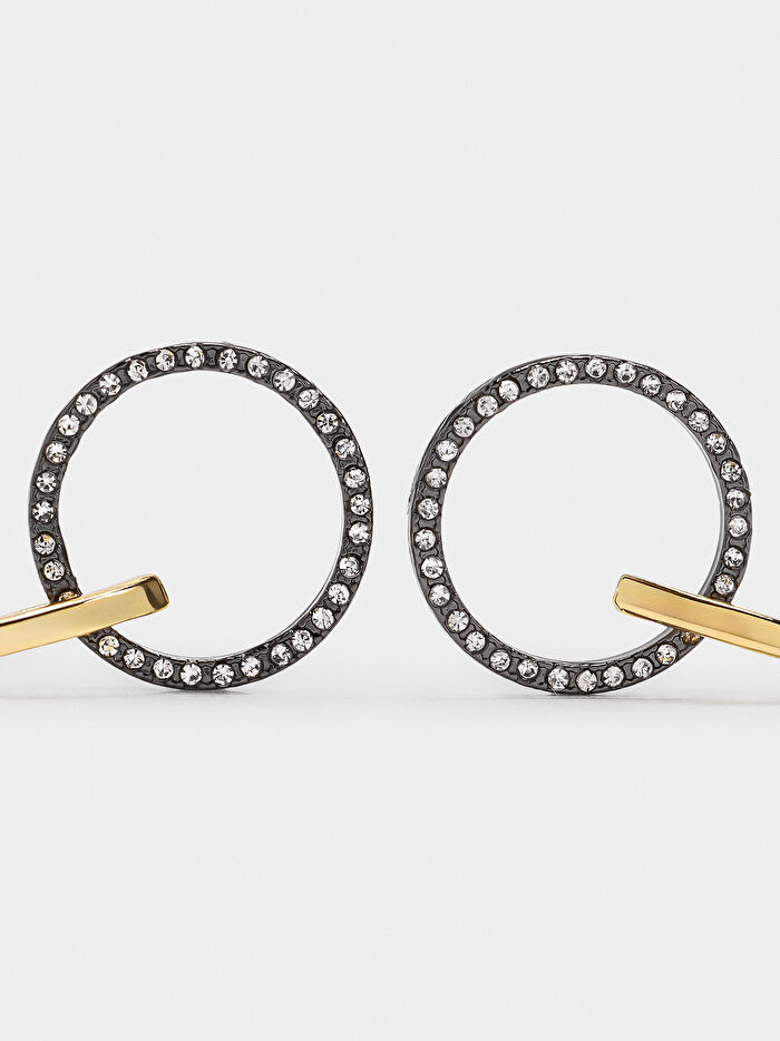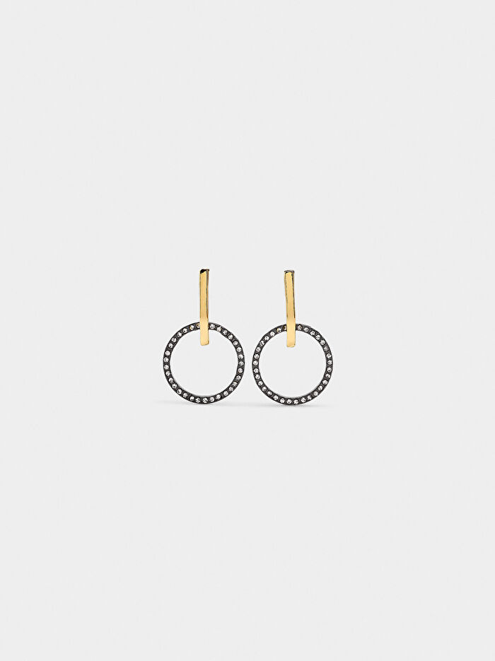 Zirkon taşlarla süslenmiş, kısa halka şeklinde küpeler. Çubuk şeklinde taban. Parlak yüzey