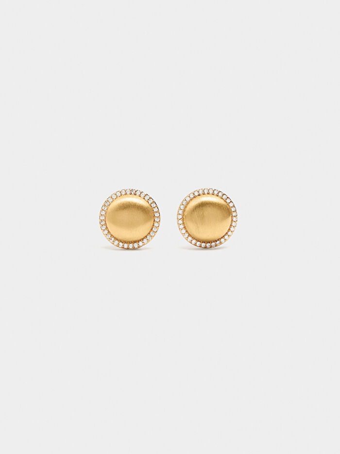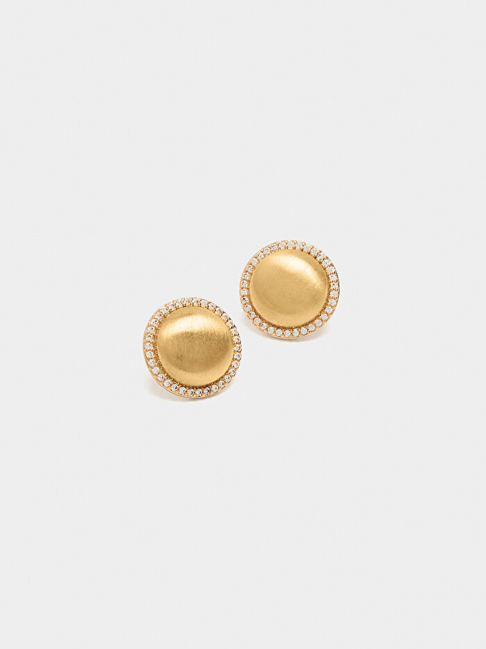 Kabartma detaylı ve kenarlarında zirkonya bulunan kısa ve yuvarlak küpeler. Mat ve fırçalanmış efekt.