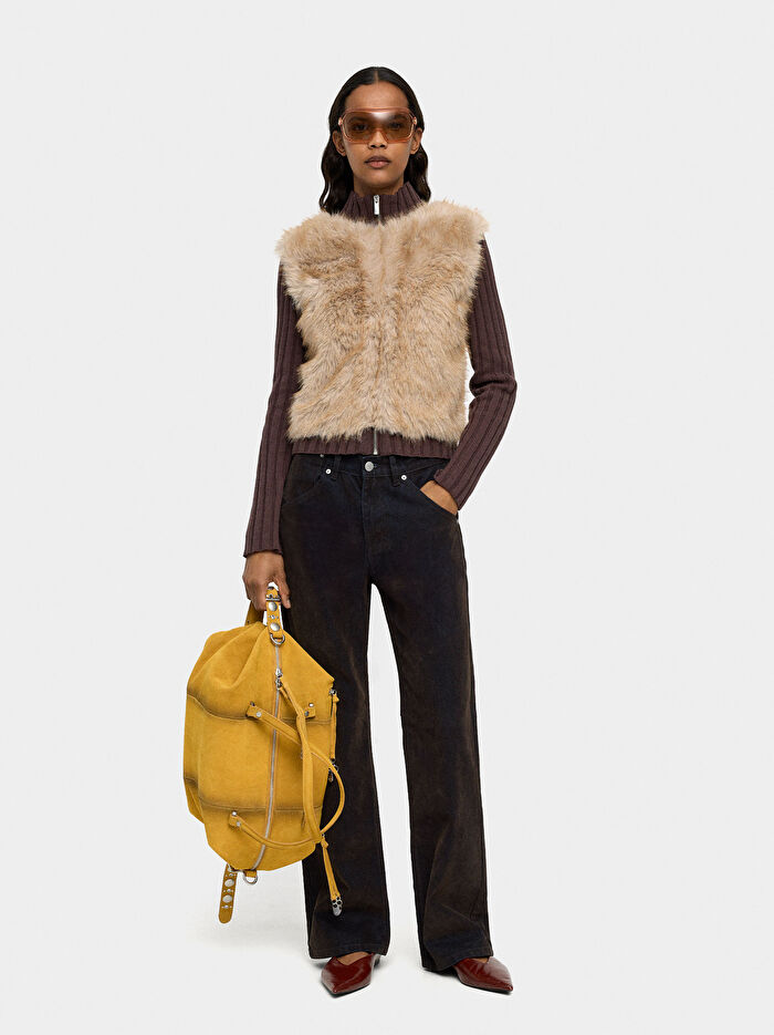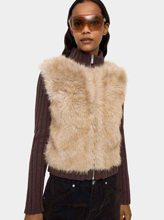 Ön kısmı tüylü efektli nervürlü örme hırka. Yüksek yaka. Uzun kollu. Fermuar kapatma. Model 1,76 m boyunda ve XS-S beden giyiyor.