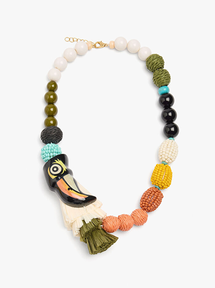 Ahşap boncuklar, taş boncuklar ve tamamen boncuklarla kaplanmış ve iç içe geçmiş rafyadan oluşan kısa kolye. Kuş detayı. Istakoz kopçalı kapatma.