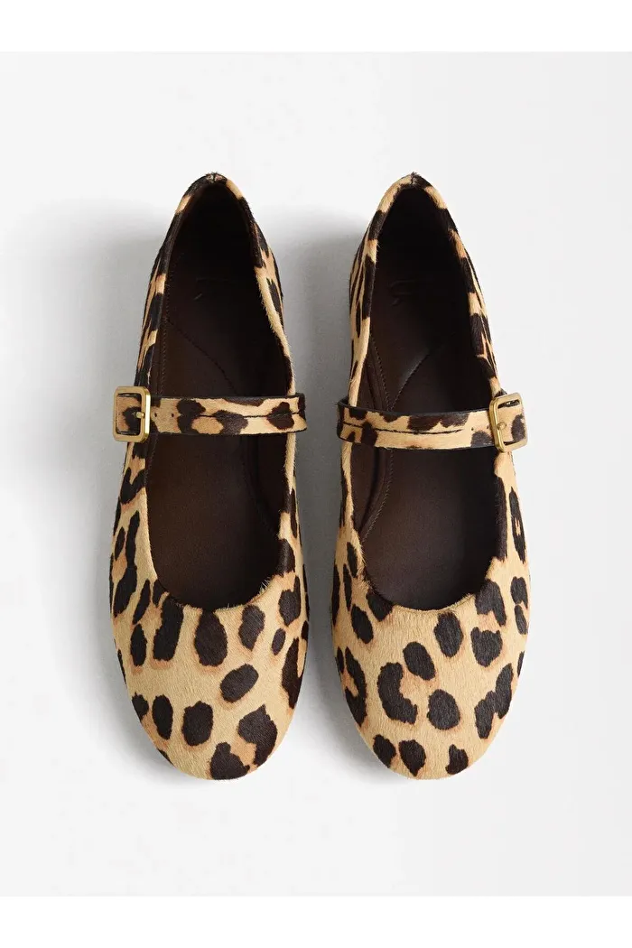 Leopar desenli kürklü babet. Tokalı kayış. Yuvarlak burunlu. Kauçuk taban.
