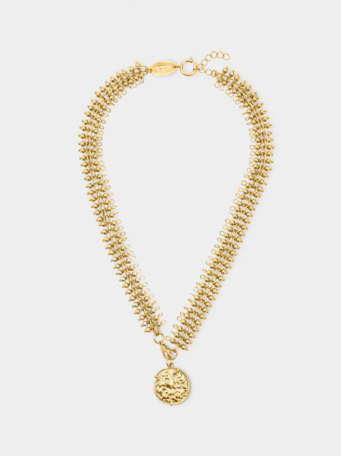 Uçlarında küre detaylı kısa ve geniş iç içe geçmiş kolye. Dövme efektli madalyon pandantif. Istakoz kopçalı kapatma.