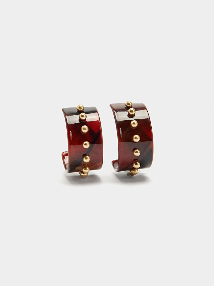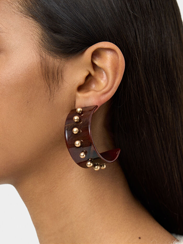 Taş efektli maxi halka küpe. Ortada metalik küre detayları.