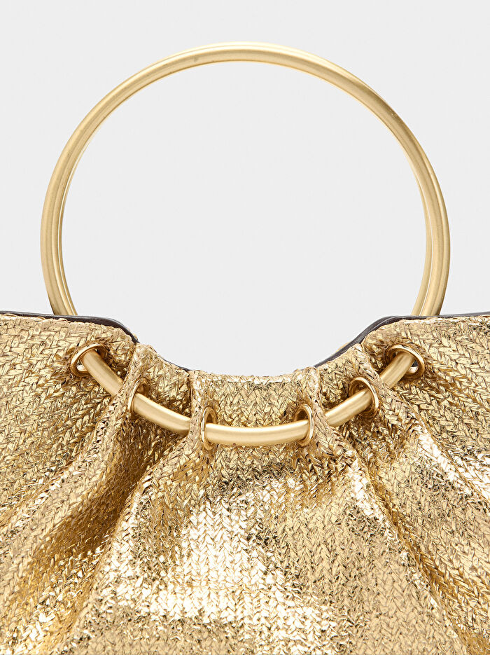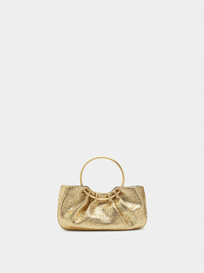 Metal halkalı metalik el çantası. Büzgülü üst kısım. İç astar. Manyetik kapatma. Çıkarılabilir zincir askı.