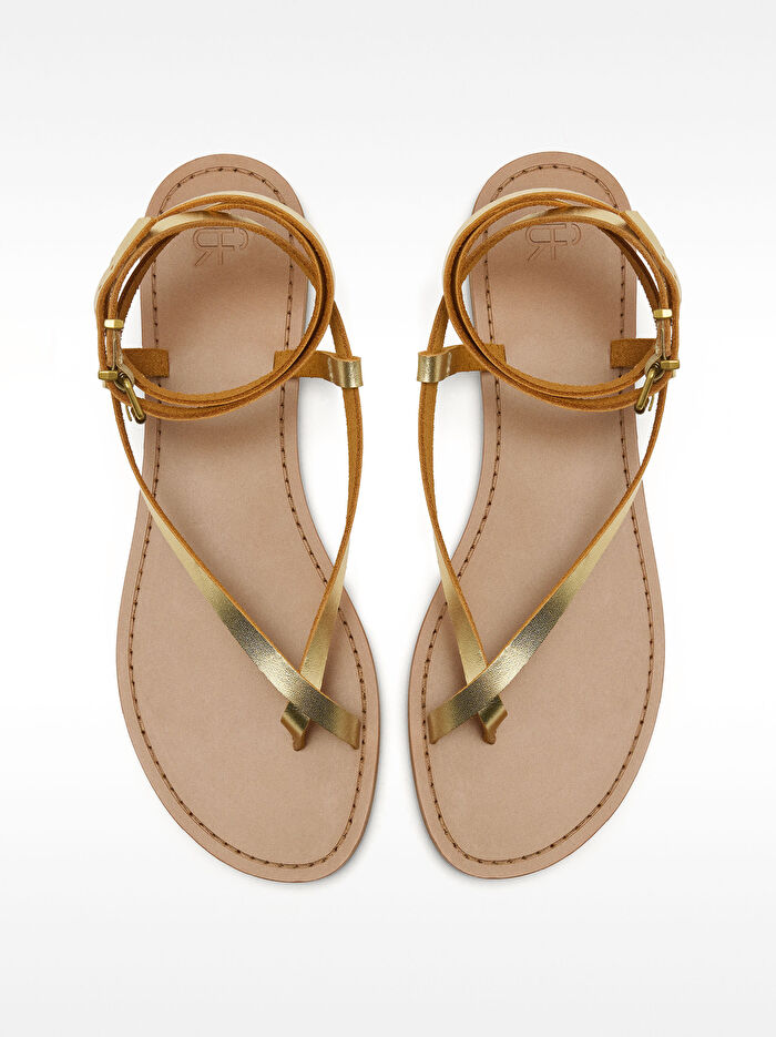 Düz metalik deri sandaletler. Ön tarafta çapraz kayışlar, ayak bileğine kadar yükseliyor, burada tekrar çaprazlanıyor ve bir toka ile tutturuluyor. Kauçuk taban.
