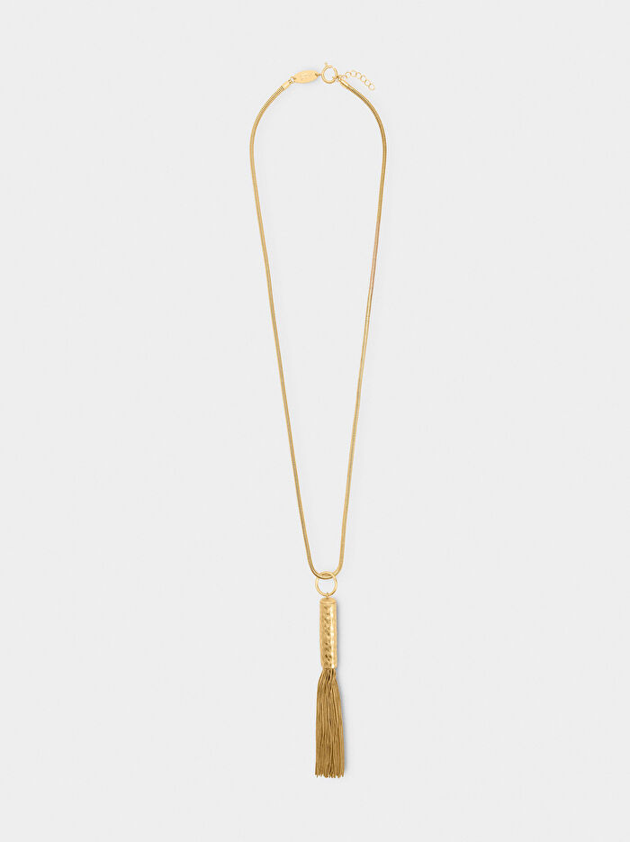 Yılan zincirli uzun kolye. Dövülmüş ve eskitilmiş efektli, metal püsküllü boru şeklinde kolye ucu.