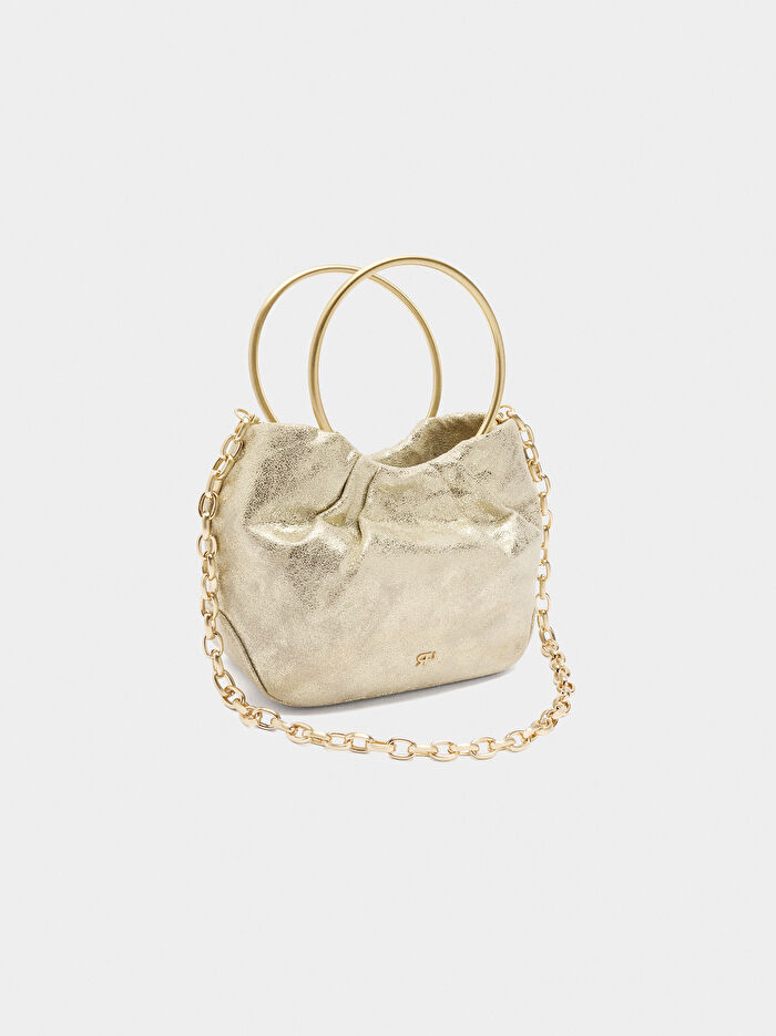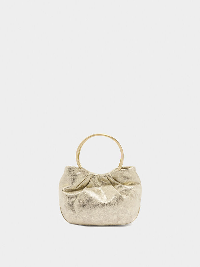Metalik el çantası. Astarlı ve iç cepli. Üst kenarı büzgülü. Mıknatıslı kapama. Sabit sert halka şeklinde sap.