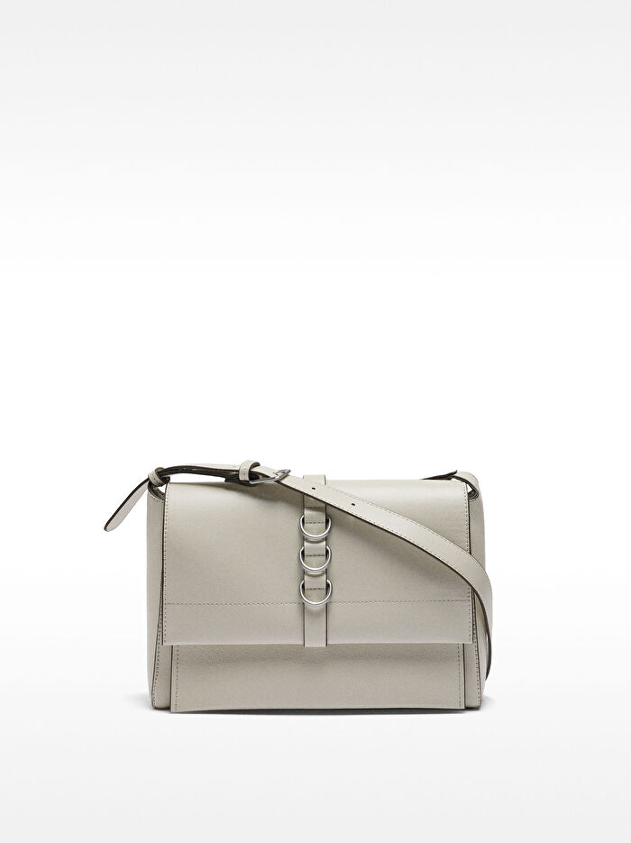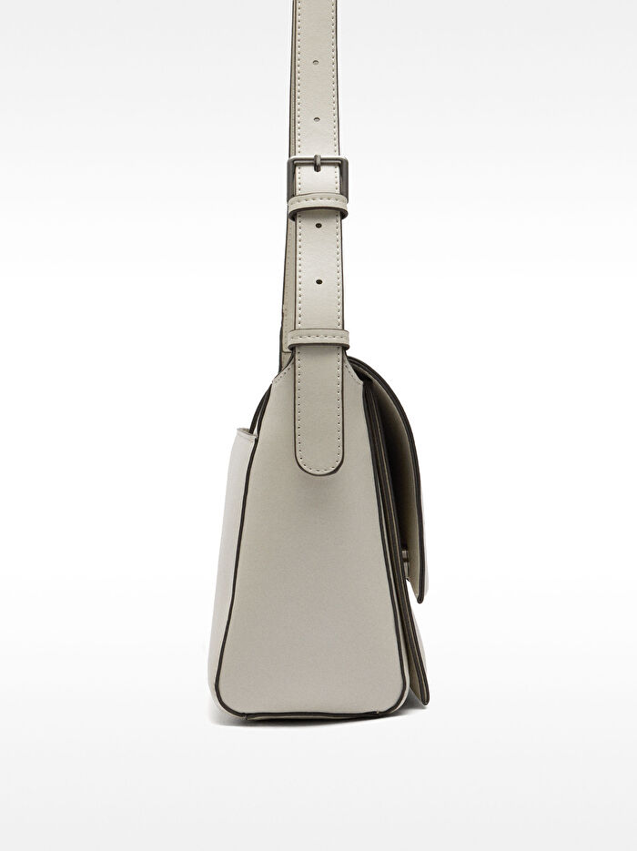 Mıknatıslı kapaklı, halka aksesuar detaylı çapraz çanta. Üç iç bölme; fermuarlı orta bölmeli ve astarlı. Ön tarafı cepli. Ayarlanabilir sabit çapraz askı.