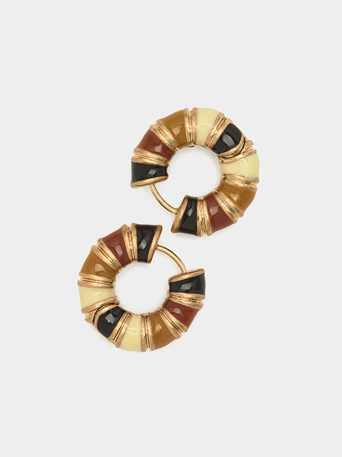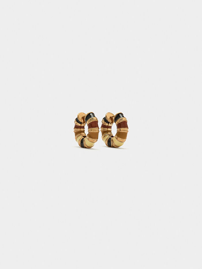 Üçgen şeklinde, ortasında mine ve çizgi detayı bulunan boru biçimli halka küpe. Eskitme efektli.