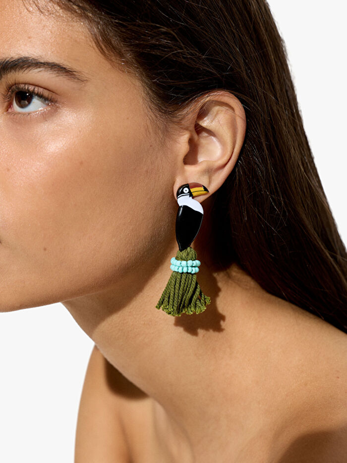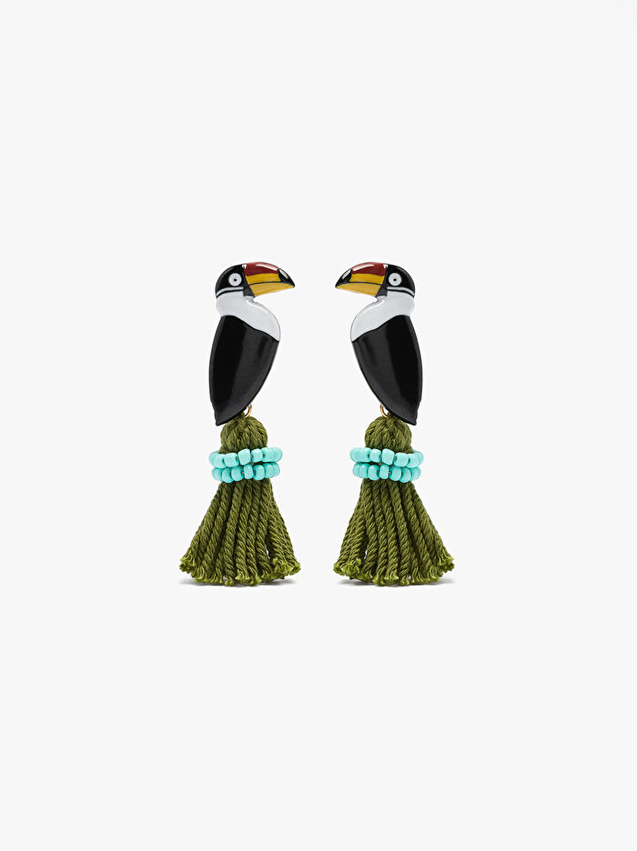 Çok renkli, emaye kuş şeklinde maxi küpeler, alt kısımda püskül detaylı. Parlak bitiş.