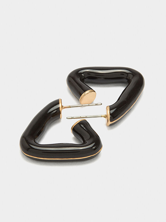 Üçgen şeklinde, ortasında mine ve çizgi detayı bulunan boru biçimli halka küpeler. Eskitme efektli.