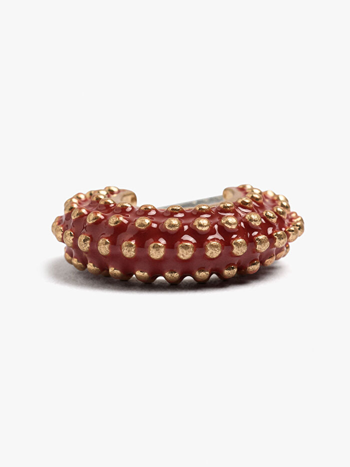 Emaye ve kabartmalı, geniş ve açık halka küpe. Metalik kenar.