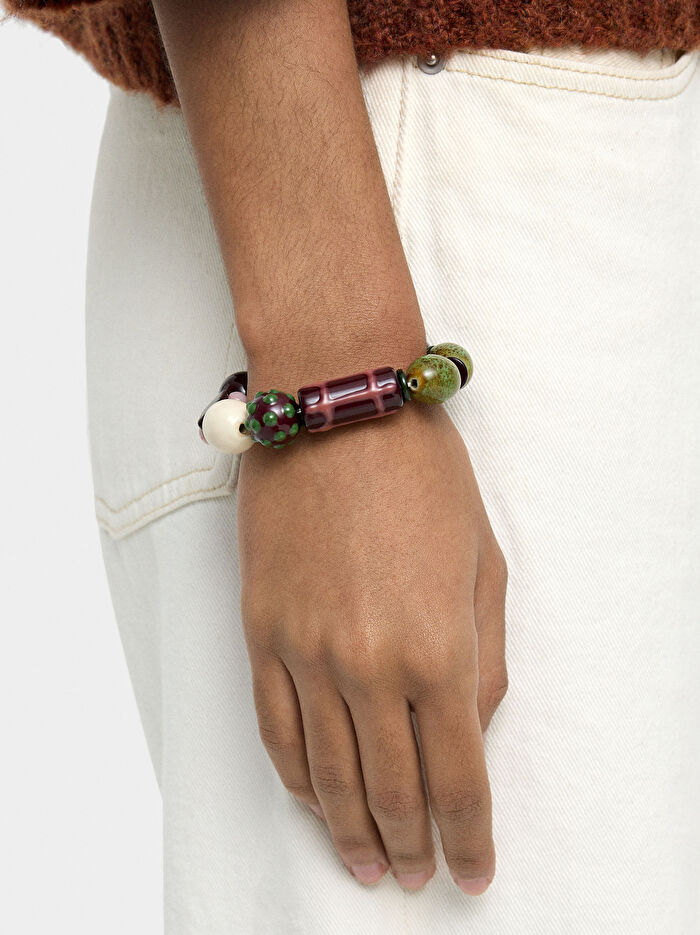 Farklı boyut, şekil ve renklerde resin ve seramikten boncuklarla süslenmiş elastik bileklik. Parlak yüzey.