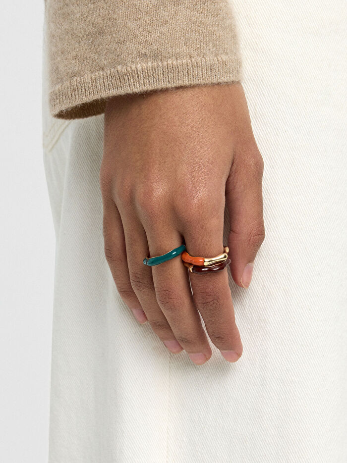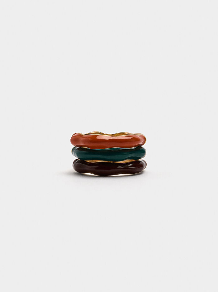 Kontrast renklerde emaye kaplı üç yüzük seti.