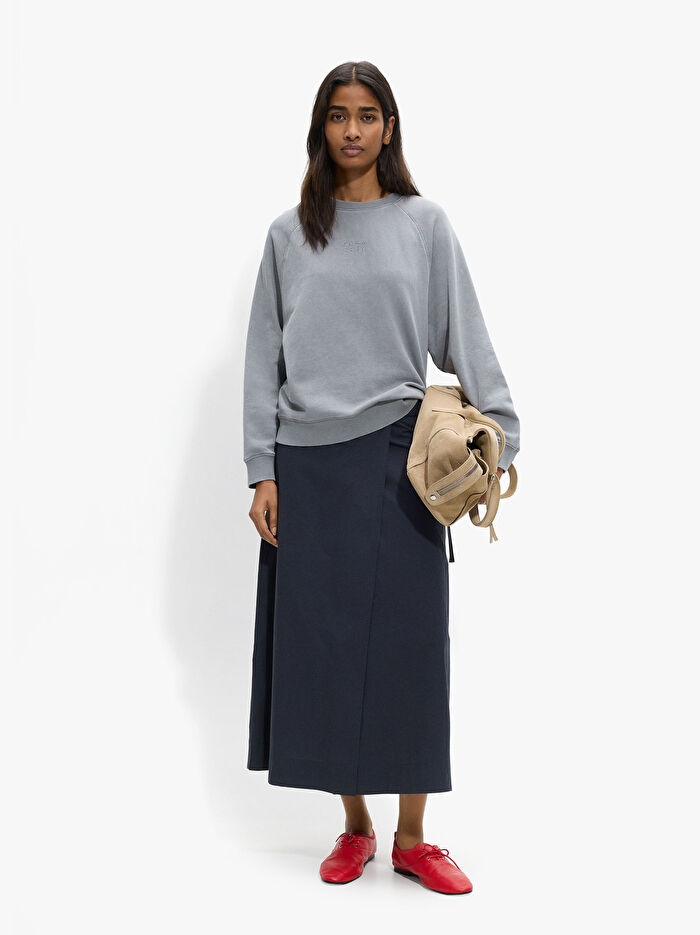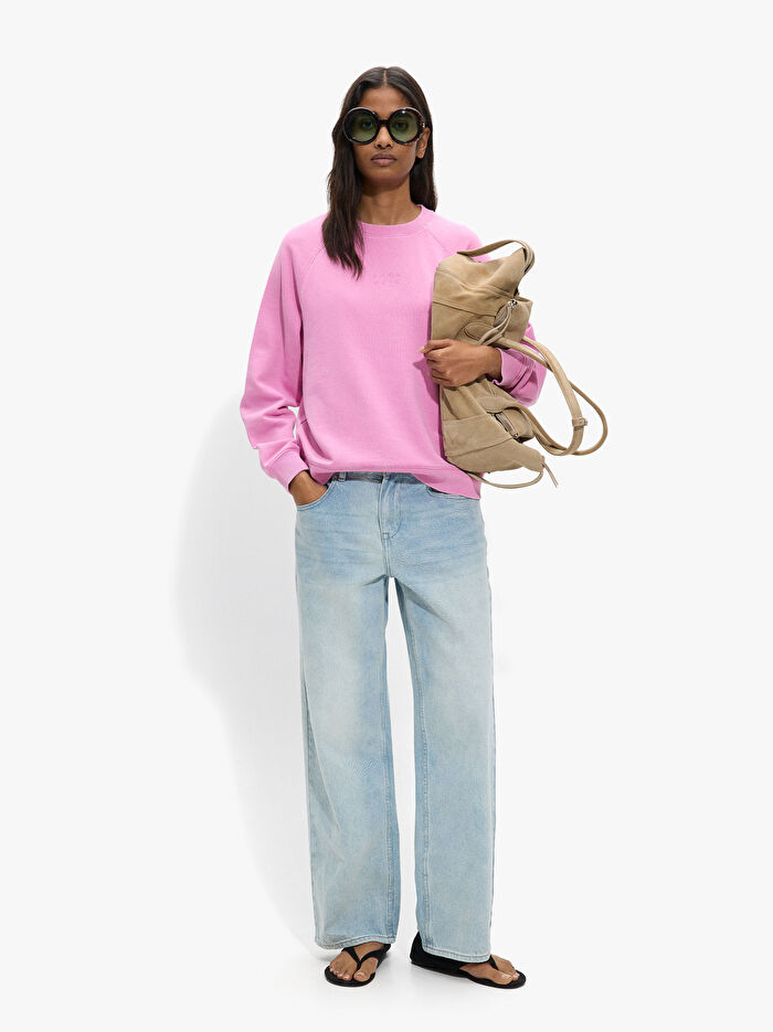 Ön kısımda nakış yazı detayı olan pamuklu sweatshirt. Yuvarlak yaka. Uzun kollu. Ribana kenarlar. Model 1.78 m boyunda ve XS-S beden giymektedir.