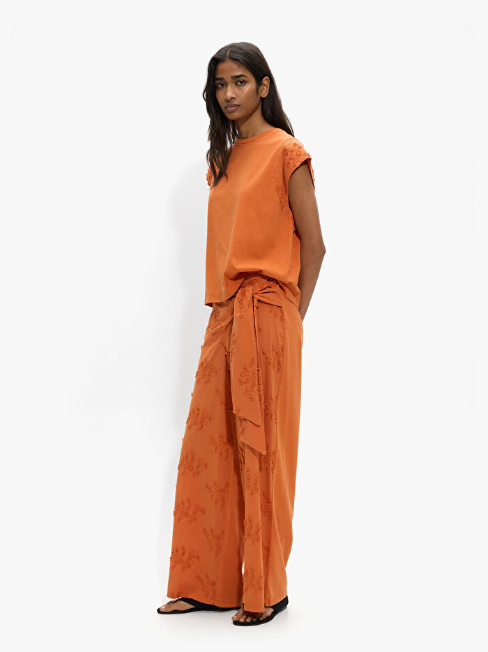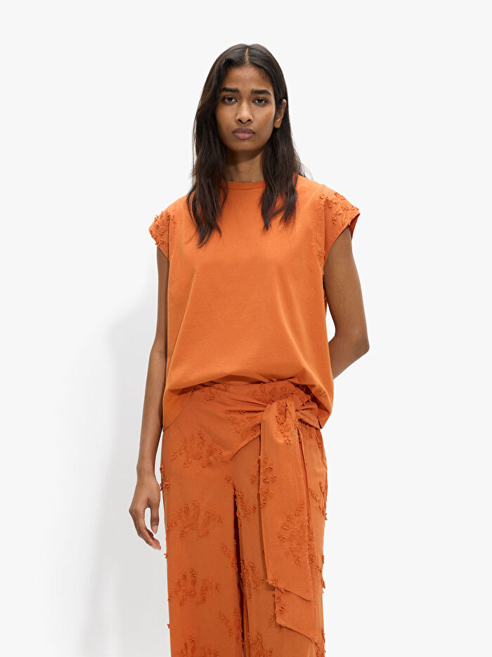 Düz kumaş pamuklu t-shirt. Yuvarlak yaka. Nakış detaylı kollar. Model 1.78 m boyunda ve XS-S beden giymektedir.