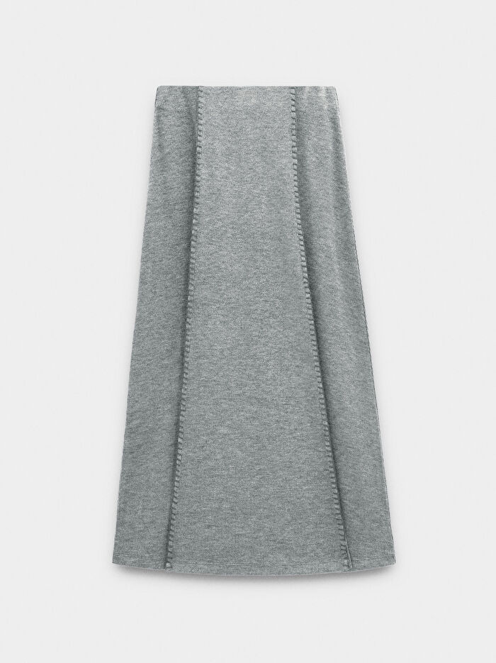 Nakışlı uzun etek. Geniş kesim. Elastik bel. Yanlarda belirgin dikişler. Model 1,76 m boyunda ve XS-S beden giyiyor.