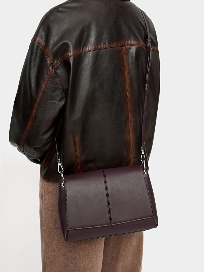 Ayarlanabilir ve çıkarılabilir çapraz askılı çanta. Orta boy. Manyetik kapaklı. Üç bölmeli. İç astarlı. Sabit el askısı.