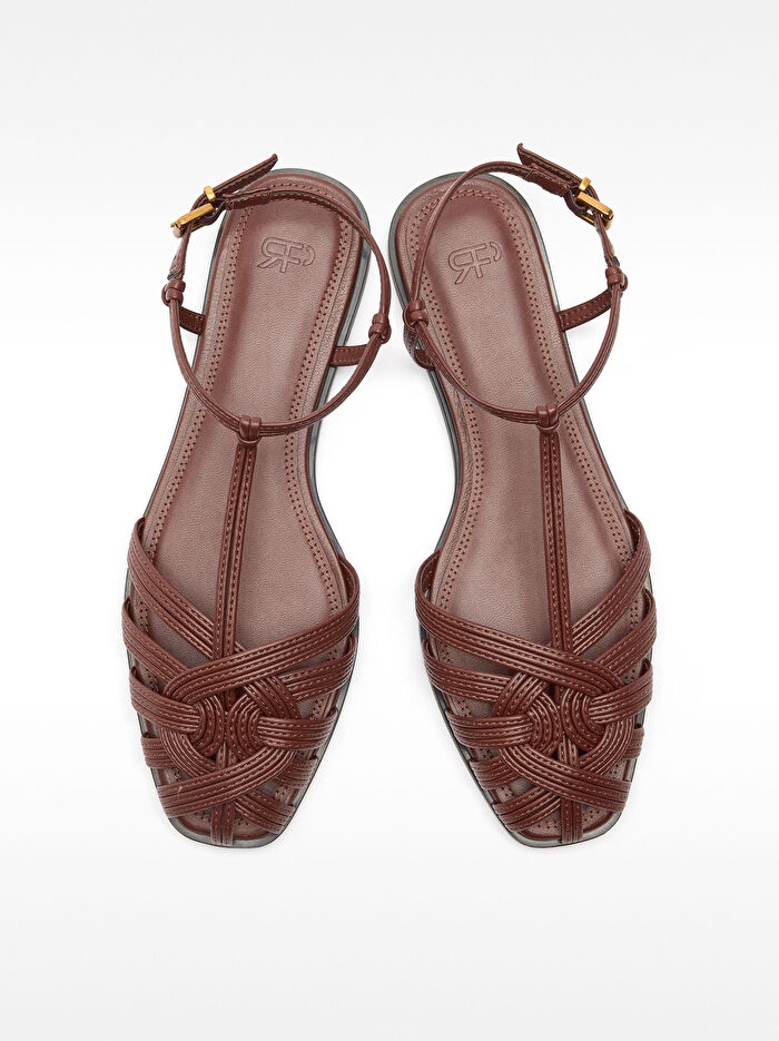 Parmak ucunda örgülü kayışları olan düz sandalet. Tokalı ayarlanabilir bilek kayışı. Dolgulu iç taban. Kare burunlu. Kauçuk taban.