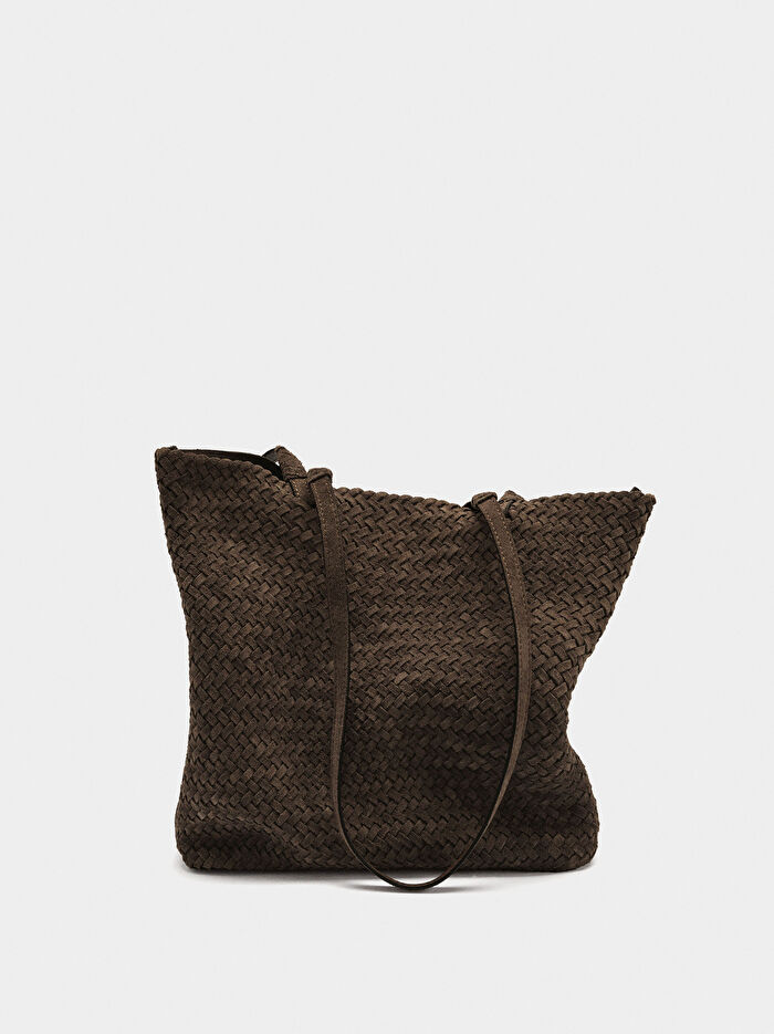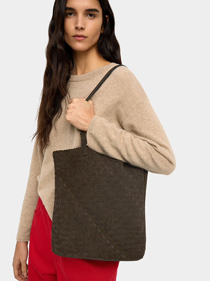 Büyük deri shopper çanta. Ön kısmında özenle örülmüş kayışlarla üretilmiştir. Kumaş astarlı geniş iç kısım; toplayıcı kordon. Sabit omuz askıları. Zarif ve her tarza uygun.