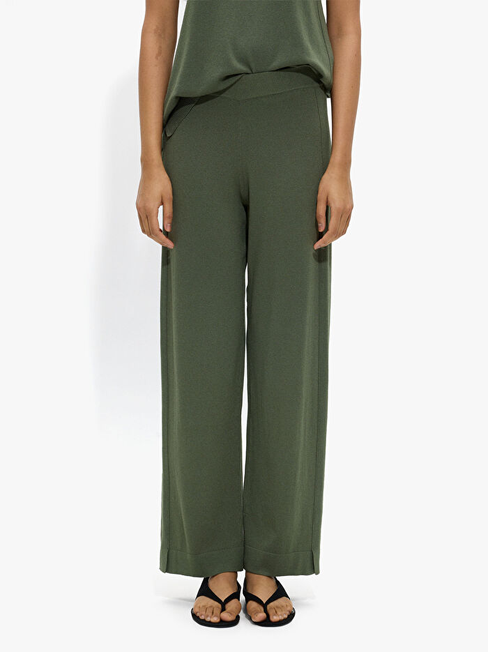 Elastik belli, düz ve örme pantolon. Model 1.77 m boyunda ve XS-S beden giymektedir.