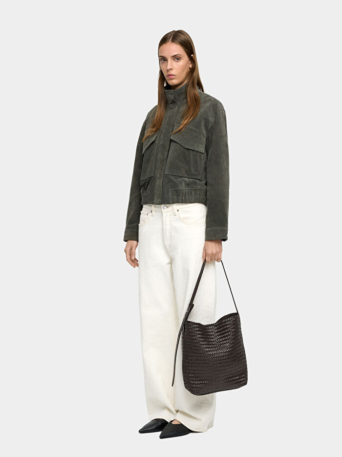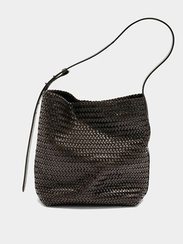 Büyük deri omuz çantası. Özenle örülmüş kayışlarla üretilmiştir. Sağlam ancak hafif yapısı ile dikkat çeker. Pamuklu kumaş astarlı geniş iç hacim. Ayarlanabilir sabit kayış. Zarif ve her tarza uygun.