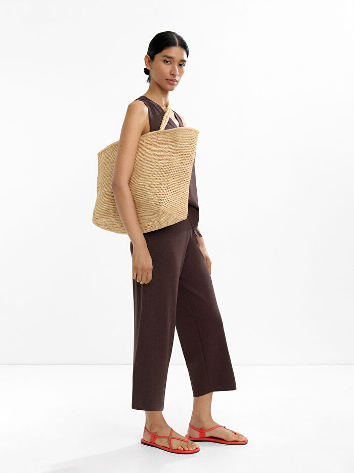 Örme düz kapri pantolon. Beli lastikli. Model 1,80 m boyunda olup XS-S beden giymektedir.