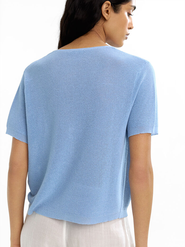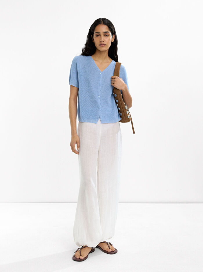 Kısa kollu örme hırka. V yaka. Düğmeli kapama. Model 1,75 m boyunda olup XS-S beden giymektedir.