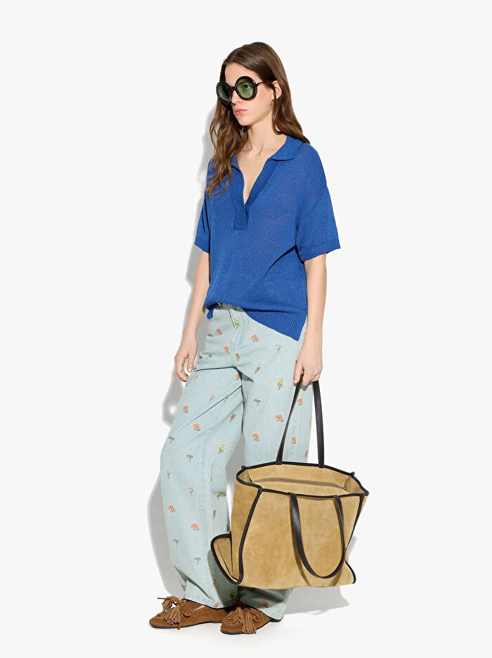 Akan örgü ve yarı saydam kazak. V yaka. Polo yaka. Kısa kollar. Alt yan yırtmaçlar. Model 1.75 m boyunda ve XS-S beden giymektedir.